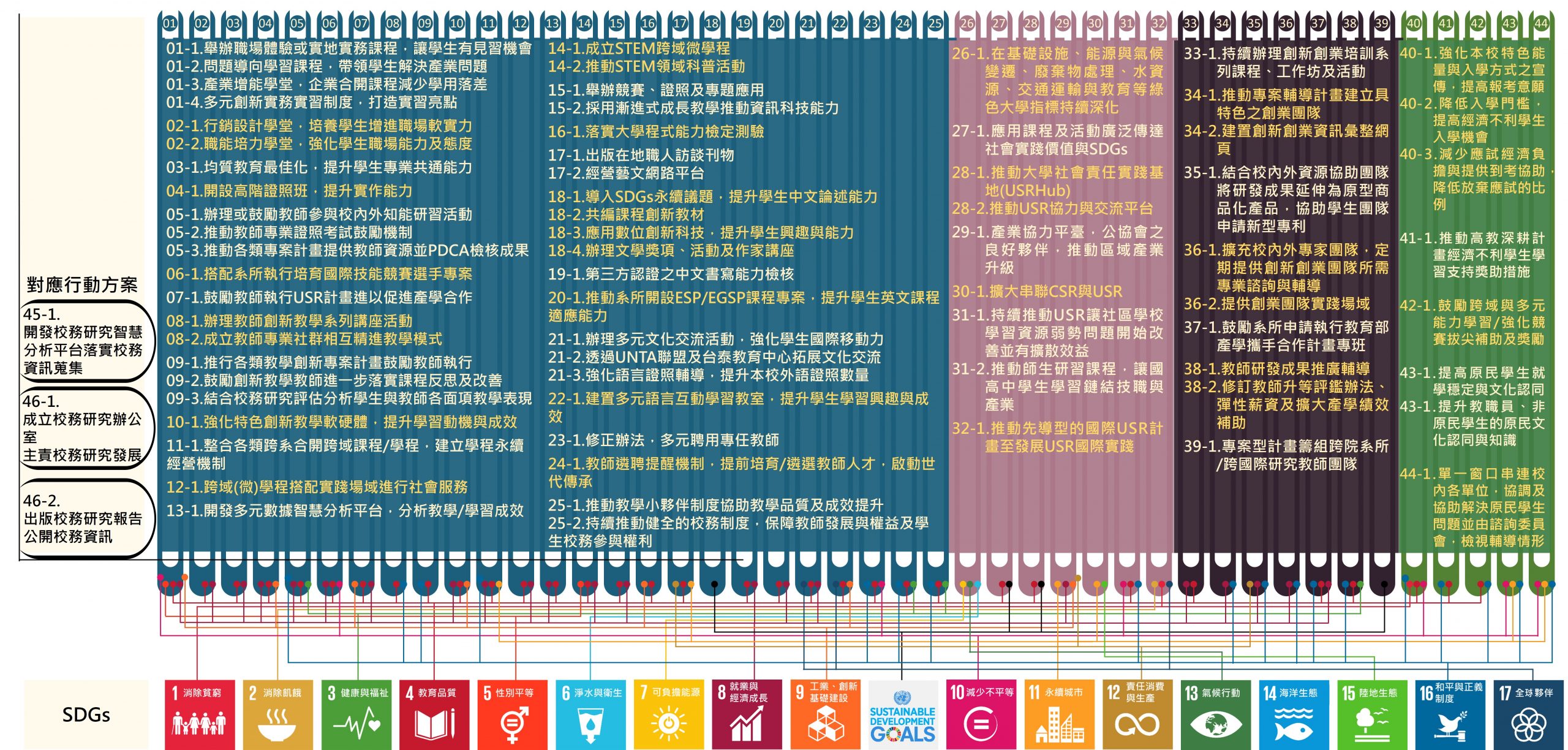 校務發展計畫訂定三化人才培育之教育發展目標及四大主軸之特色發展目標,並設有跨單位且能垂直分工與橫向整合之十大行動方案,由行政與學術一級單位規劃核心議題與執行內容。
