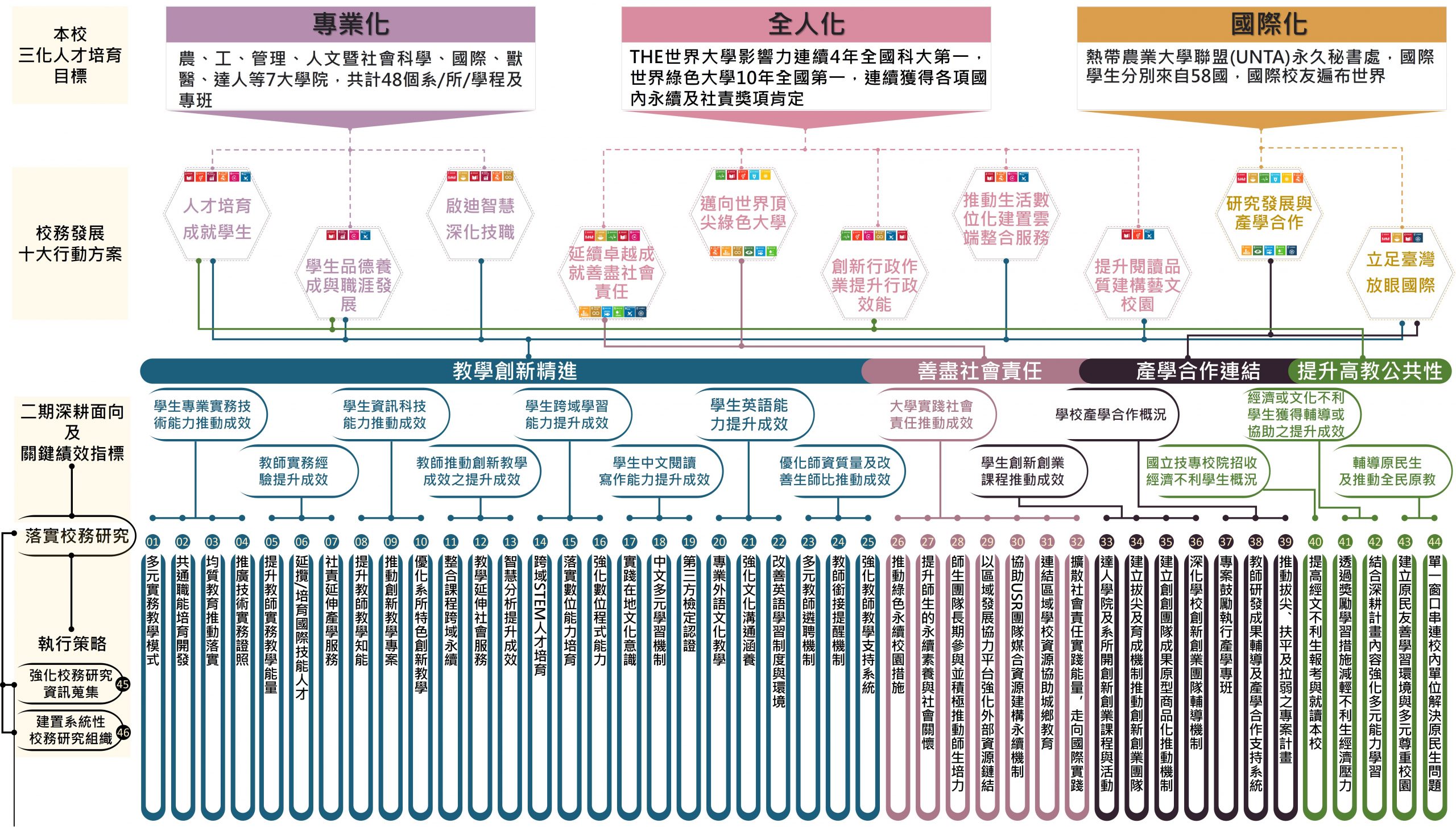 綜整第一期各面向指標與本校執行各類計畫成效及校務研究議題分析及納入SDGs的精神與方針和深耕計畫執行成果反饋,並審酌本校校務中長程規劃及全方位農業科技大學之特色,進行整體二期深耕計畫之執行內容規劃,擬定46項策略及73個行動方案。每年依據管考機制執行成效評估、提出精進調整作為,期以打造本校成為新興產業需求四跨人才之整合型跨領域科技大學,更為具備永續發展及社會影響力的國際一流全方位農業科技大學。