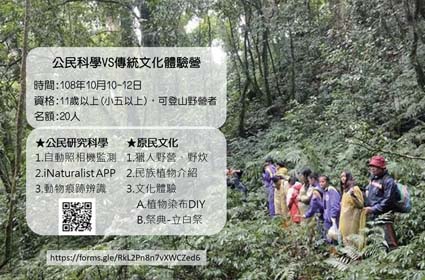 • 本計畫第1年與那瑪夏國中、民生國小發展「公民科學家野生動物監測系列課程」,獲得部落的肯定,透過「公民科學家原鄉人文生態探索營隊-創新設計工作坊」系列課程的舉辦,與族人成立「獵人學校工作團隊」,發展出以公民科學調查技術課程為基礎,結合傳統歲時祭儀、傳統原民動植物文化的「公民科學家原鄉人文生態探索營隊」。