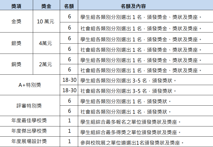覽、得獎作品分享交流對談活動;後續由本競賽評審過程視各作品表現程度另