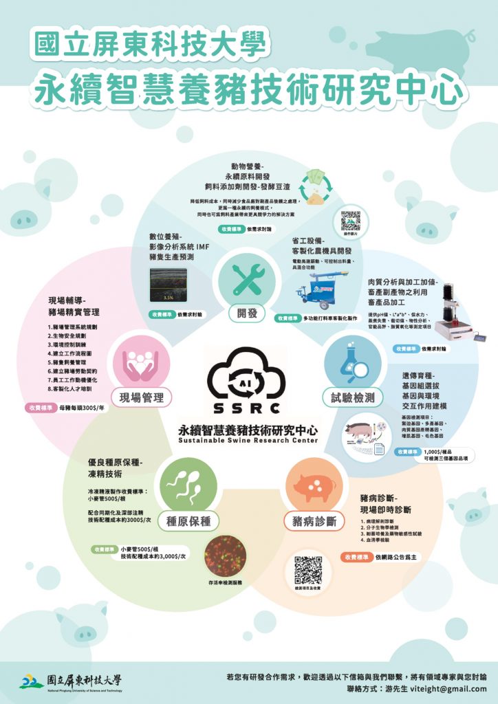 因應國內養豬產業升級與轉型挑戰,國立屏東科技大學成立「永續智慧養豬技術研究中心」,致力於突破技術瓶頸、培育專業人才,並提升整體產業競爭力。本中心積極整合校內跨領域資源,結合獸醫學系、動物科學與畜產系、生物機電工程系與熱帶農業暨國際合作系等系所,並攜手動物製劑研究中心、大數據科技研發服務中心與熱帶養豬技術諮詢培育中心,打造橫跨遺傳基因與病原快速檢測、大數據分析與智慧飼養等面向的技術支援體系,強化研發效能與實務應用。